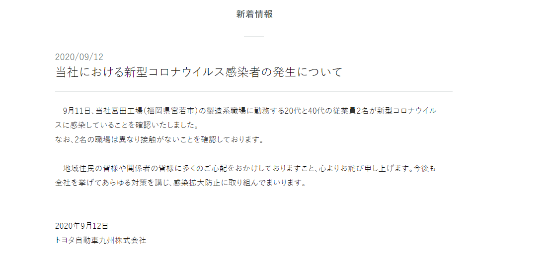 9/11-9/13にかけて、トヨタ九州内にて新型コロナ感染者が3名確認されました。保健所の調査等が行われた様子ですが今回は複数名の濃厚接触者も出ていた様子。